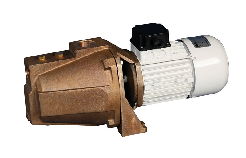 Elettropompa centrifuga autoadescante tipo Jet a girante chiusa in bronzo a 24V. dc, dalla elevata capacità di aspirazione, comunemente utilizzata per la distribuzione di acqua in pressione nei servizi di bordo (docce, cucine, lavandini,wc, ecc.), per gruppi di condizionamento, antincendio, lavaggio ponti e catene.